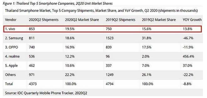 IDC公司最新報告顯示,2020年第二季度,泰國智能手機市場出貨量達到430萬臺,環比增長21.2%,表現出復蘇的跡象。在泰國市場中,中國智能手機品牌vivo以19.5%的市場份額位居榜首,同比增長13.8%。