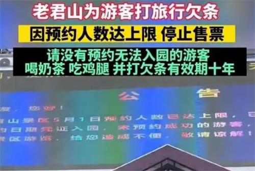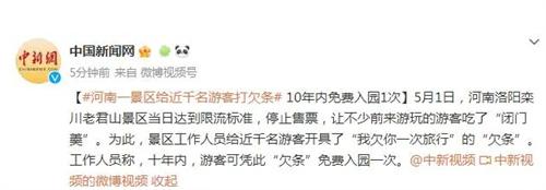 北京時(shí)間5月1號洛陽欒川縣老君山景區(qū)因?yàn)橛慰统休d量已經(jīng)達(dá)到了極限。導(dǎo)致許多沒有提前預(yù)約來旅游的游客遭到了限流,沒有能夠成功進(jìn)入景區(qū),為了進(jìn)一步安撫游客的情緒景區(qū)的工作人員也在景區(qū)門口為上千名游客都送上了簡單的午餐以及奶茶,還向沒有能夠成功進(jìn)入景區(qū)的游客打下了這樣一張欠條,欠條上寫上我欠您一次旅行,憑借此欠條可以免費(fèi)入園旅游一次有效期10年。