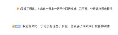 針對于端午節(jié)放假的時間網(wǎng)友就表示通過調休的方式應湊出三天的休息,在端午節(jié)放假結束之后還需要上6天班,太累了還不如直接放一天假上一天班周末再連續(xù)休兩天,已經(jīng)受夠了調休上一天休兩天多好非要搞成調休。也有網(wǎng)友表示取消調休吧,我寧可沒有這些小長假也受夠了正常雙休的時間被各種假期調休占用。