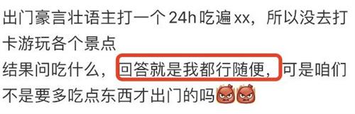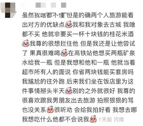 在評論區(qū)內(nèi)能看到,其實(shí)吵架的對象不僅僅是對象,大部分只要出門旅行的人都會遇到吵架的經(jīng)歷,吵架的原因也五花八門,被網(wǎng)友吐槽最多的地方就是拍照問題,幾乎每一個男朋友在給對象拍照的時候都會被罵,網(wǎng)友吐槽男子就是不愛她才發(fā)現(xiàn)不了自己的美。其次被吐槽最多的就是男的一句“隨便”,每次女子問男子想吃什么、想玩什么、想買什么,得到的回復(fù)都是一句“隨便”。
