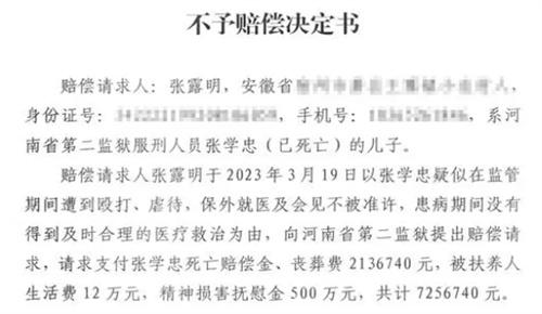 河南省第二監獄披露的不予賠償決定書中,就認為張學忠在監獄服刑的過程中,并不存在遭受人員毆打,虐待的情形,在張學忠身患胰腺癌之后,監獄也對張學忠給予了及時治療醫治的行為,張學忠死亡是因病正常死亡,他的死亡原因和監獄的監管行為并沒有任何法律上的一個關系,因此監獄作出了不予賠償的決定。