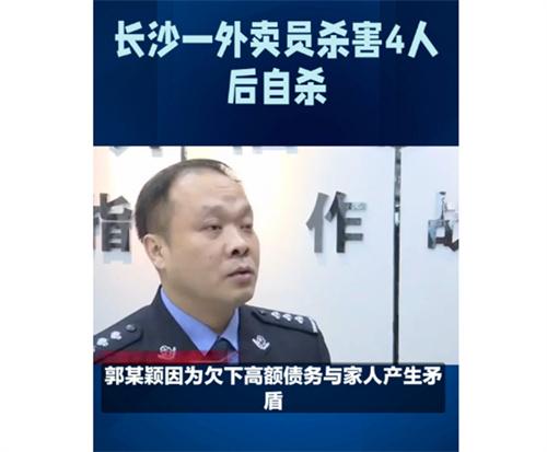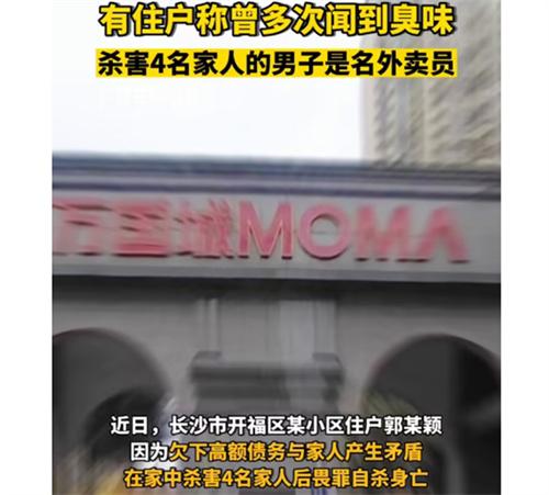 當地時間5月26日,湖南省長沙市開福警方發布一則警情通報,通報中表述,在5月24日晚,長沙市開福區某小區住戶郭某,因為欠下巨額債務與家人發生矛盾,導致在家中殺害四名家人后畏罪自殺,此次事件中最小的受害者是郭某的女兒,年僅四歲,據采訪該小區居民所述,郭某的工作是從事外賣行業,案發房子是在萬國城小區三期某棟六樓四號房。