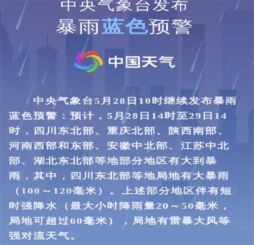5月28日10:00,中央氣象臺發(fā)布暴雨藍色預(yù)警預(yù)計四川東北部、陜西南部、重慶北部、安徽中北部、河南西部和東部、湖北東北部以及江蘇中北部等地區(qū)5月28日14:00到29日14:00,將會出現(xiàn)大到暴雨。這些地區(qū)會有短時間的強降雨,降雨量最小可能是在20~50毫米之間,局部地區(qū)會超過60毫米。四川東北部等局部地區(qū)很有可能會出現(xiàn)大暴雨,降水的強度會達到100~120毫米,部分地區(qū)還有可能會出現(xiàn)雷暴大風(fēng)的強對流的天氣。各地的政府部門以及相關(guān)機構(gòu)一定要做好預(yù)防。