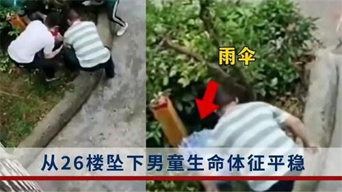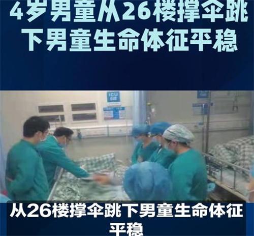 湖南吉首一名4歲的男孩5月26日下午從家中26樓墜落。目前正在當地醫院進行治療,生命體征平穩,全身有多處骨折。據知情人士透露,男孩當時是模仿動畫片中的情節,使用雨傘當降落傘從家中的陽臺跳下來,幸虧降落的時候有雨傘和樹枝擋了一下,起到了一定的緩沖作用,男孩目前并沒有生命危險只是四肢,除右手以外均骨折。