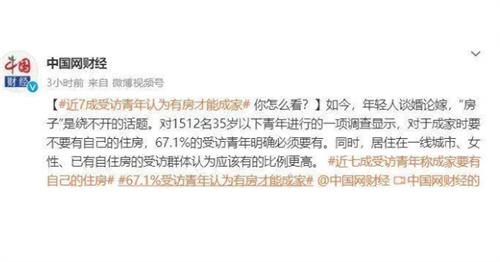 近日,中國青年心報社會調查中聯合問卷中,對1512名35歲以下青年做出了問卷調查,該調查主題為成家時需不需要有房,受訪者有67.1%的人員表示必須要有房。12.9%的受訪人群認為沒必要有房,20%的受訪人群認為要看實際情況,在七成以上的受訪者眼中,租房始終是一種飄零的生活狀態,只有買了房才能夠代表自己落葉歸根,意味著可以有一個屬于自己的家。