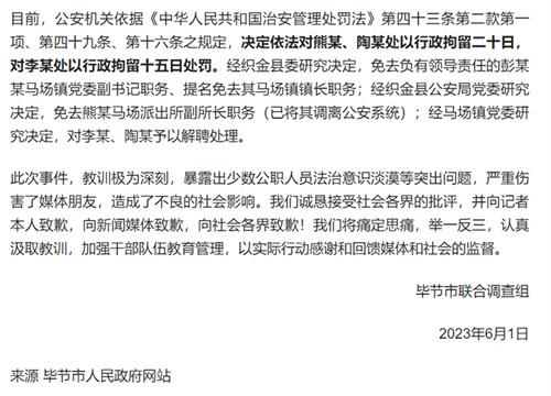 事件中的熊某為織金縣公安局馬場派出所副所長,李某和陶某為馬場派出所警務(wù)輔助人員,事件發(fā)生后,織金縣委決定的,免具有領(lǐng)導(dǎo)責(zé)任的彭某、馬廠鎮(zhèn)黨委副書記職務(wù)、織金縣公安局黨委決定免去熊某馬場派出所副所長職務(wù),經(jīng)過馬廠鎮(zhèn)黨委研究,對這起事件中的陶某和李某解聘。