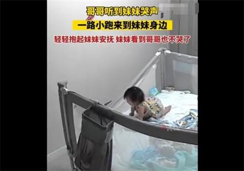 6月2日,有網友上傳一段視頻,視頻中一位小男孩在房間外聽到妹妹的哭聲,迅速跑到妹妹身邊,抱起妹妹安撫她的情緒,而妹妹看到哥哥來后瞬間不哭了。這一段視頻在網上流傳后,引起很多網友的議論,眾多網友稱這樣的場景簡直太暖心了,雖然視頻中的故事很簡單,但是傳遞出了這對兄妹之間濃濃的情感。