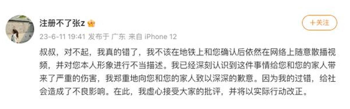 2023年6月9日,一名來自四川大學的女大學生在乘坐地鐵時懷疑蹲坐在地上的一名大叔偷拍自己,于是以質疑為由查看大叔手機,并無確鑿證據后,私自將大叔的照片發布至網絡平臺進行網暴,并聲稱大叔為猥瑣男,為大叔及其家人帶來不良影響。警方介入后,雙方形成和解局面,胡錫進于6月12日表示,支持四川大學處分曝光大叔的女生。