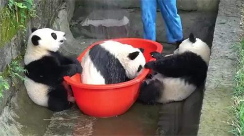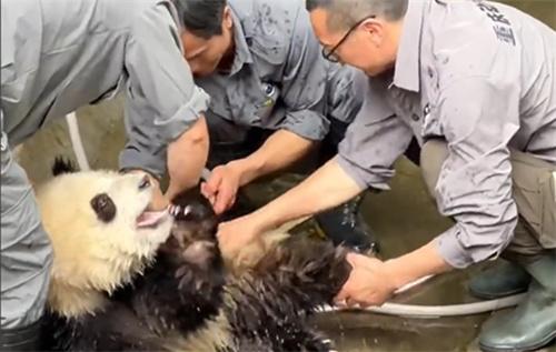 2023年6月11日,來自重慶動物園的兩只大熊貓于渝可渝愛洗澡的視頻在網絡平臺曝光。視頻中,三名工作人員手忙腳亂,兩個半人負責摁下大熊貓,剩下半個負責為大熊貓洗澡,場面一度十分搞笑。