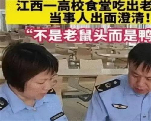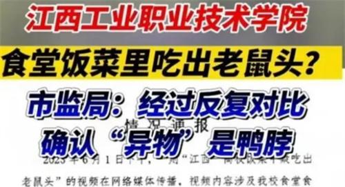 6月17號聯合調查組指出由江西工業職業技術學院,南昌高新區市場監督管理局昌東分局沒有經過認真調查取證說異物是鴨脖的結論是錯誤的。這個結論一經發布之后立刻引起了公眾的反響,早在6月1號的時候學生就反映在該食堂吃出了疑似老鼠頭的異物,之后通過查看該食堂的后廚視頻、查閱食堂的采購清單,詢問后廚相關涉事人以及當事學生還有現場圍觀學生等。判定餐盤中出現的異物并不是鴨脖,國內權威動物專家根據學生所提供的拍攝現場視頻以及照片進行了專業度的辨識,判定餐盤中的異物就是老鼠類的嚙齒動物的頭部。