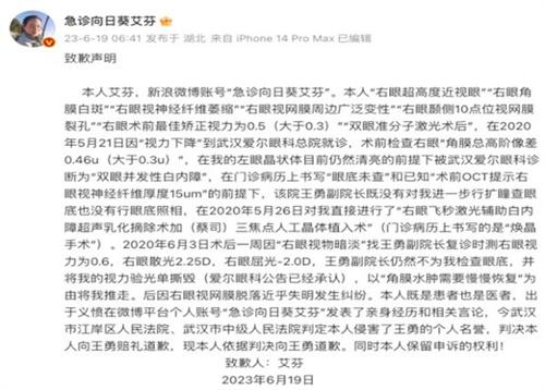 愛爾眼科王勇不接受艾芬的公開道歉。就在最近持續了三年的武漢愛爾眼科與知名醫生艾芬之間的醫療糾紛有了新的進展。艾芬在6月19日的上午發布微博,公開向愛爾眼科主刀醫生王勇道歉,但是仍然保留了繼續申訴的權利。王勇醫生在當天下午回應,由于艾芬道歉,未經終審判決裁定,并且繼續歪曲事實,所以拒絕接受道歉。網友醫生表示會依法申請,法院對艾芬的強制執行,并且會視情況再次起訴。
