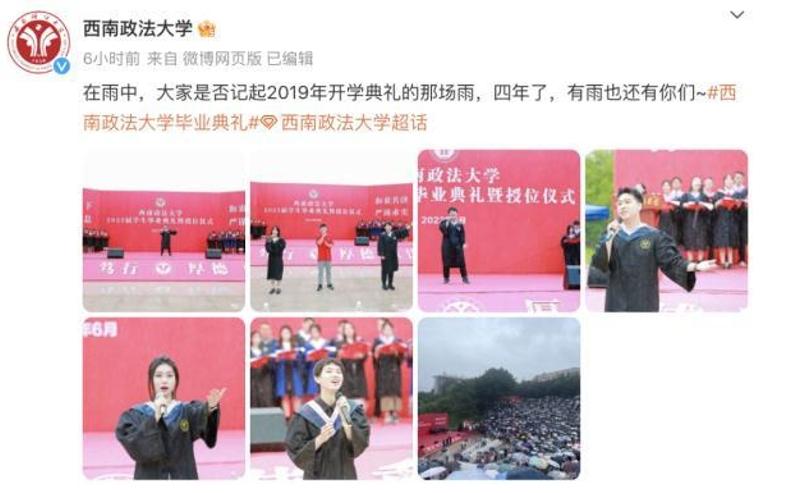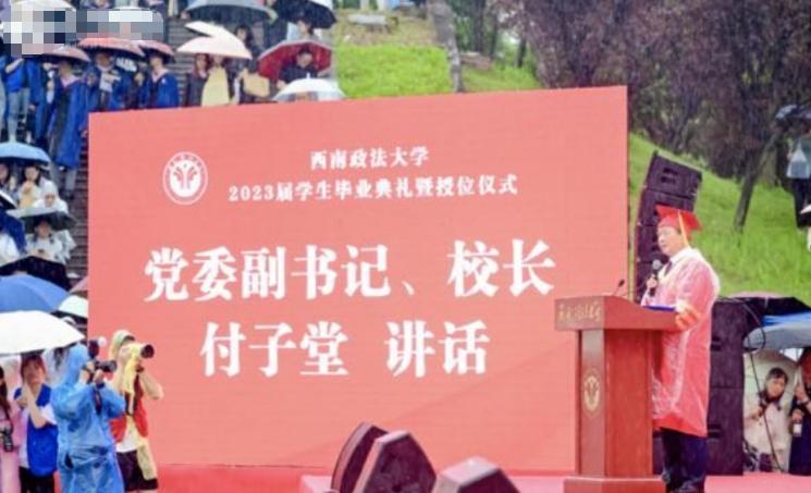 北京時間6月21號上午,西南政法大學舉行的2023屆學生畢業典禮,今年的畢業典禮學校還邀請了2020至2022屆的畢業生中的兩百位代表返校參加畢業典禮。畢業典禮當天遭遇到了大雨,為了能夠讓學生們少淋雨,西南政法大學校長在發表演講的時候,將原本準備的3500多字的演講稿內容總結成兩個知識點,知行合一致良知,德法兼修事上練,并且補充說這本來是我典禮字詞的標題。然后全文闡述,請參照學校官微的一個推送,在四年前的開學典禮的同學們同樣是經歷了一場雨。