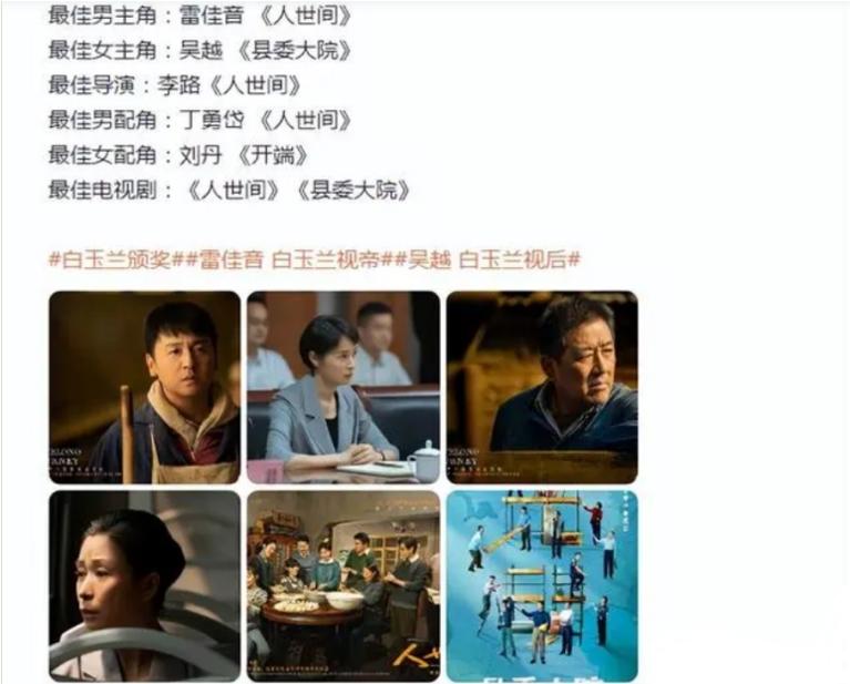 6月23日,第28屆白玉蘭頒獎典禮正式落下帷幕,雷佳音憑借《人世間》的精彩演技拿到了最佳男主角,吳越憑借《縣委大院》的出色發揮拿下的最佳女主角。這二人的演技毋庸置疑,在得獎之后紛紛發表獲獎感言,發言感謝了影劇的導演以及各位老師,在他們獲獎之后,《我的前半生》另外一位女主角馬伊俐。在當晚迫不及待的向雷佳音和吳越表示恭喜,說俊生和凌玲祝福你們,真的替二位感到高興。