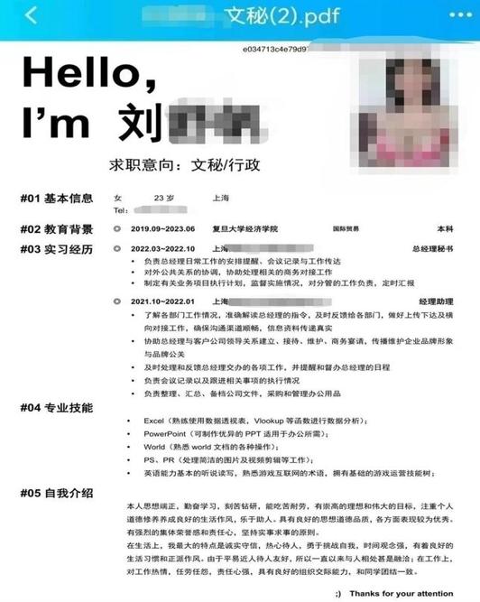 北京時間6月26日,一份復(fù)旦大學(xué)女畢業(yè)生的求職簡歷流傳網(wǎng)絡(luò),其附帶的照片可以說是衣著暴露。簡歷內(nèi)容顯示,畢業(yè)生劉某凡今年23歲,于2019年6月~2023年就讀復(fù)旦大學(xué)經(jīng)濟學(xué)院,曾經(jīng)在上海兩家企業(yè)實習(xí),求職意向為文秘和行政。稱其自己思想端正,勤奮學(xué)習(xí),有崇高的理想和偉大的目標(biāo)。經(jīng)過查證,復(fù)旦大學(xué)經(jīng)濟學(xué)院反映該女子并非是該校的畢業(yè)生,應(yīng)該是不實的信息。同時也有工作人員表示,這位同學(xué)不是我們學(xué)校,也不是我們學(xué)院的,這一看就是假的,非常的夸張,也希望各位網(wǎng)友隨手舉報。