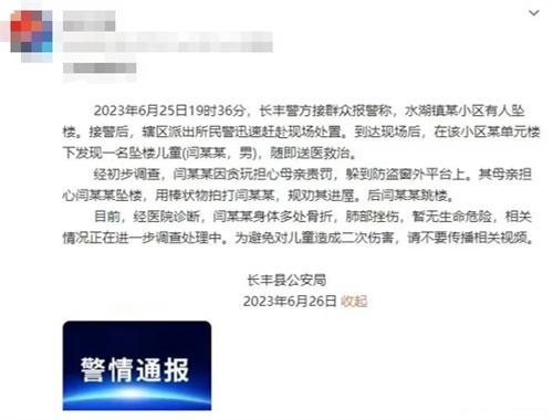 在現場圍觀的群眾們也在不斷的嘶吼,不能再打了,不能再打了,男孩子在落地以后仍然還有知覺,周圍的熱心居民提醒男孩不要動,并且馬上撥打了120,對此,該地區的婦聯工作人員表示,小孩子現在沒有問題,自己不小心掉下來的,他調皮媽媽拿個棍子嚇唬他,事后小男孩被緊急送往醫院去進行搶救,醫院表示孩子的傷情較重,已經轉移到了安徽省兒童醫院。