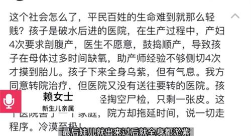 據網友表示助產師側切4次之后才順利的摸到胎兒的位置,四次側切也是令人感到難以置信的,很難想象到產婦究竟承受了多大傷害,孩子在生下之后只有一些氣息,并且十分微弱,全身出現污漬的情況。面對這樣的情況,醫院給出的是轉院治療的建議,家屬無奈只能同一建議,但在家長同意轉院治療之后,醫院有沒有讓孕婦與嬰兒轉去醫治的醫院,在這樣的情況下導致了嬰兒身亡,家屬對此也感到十分難受,并且是很難接受這樣事實的。