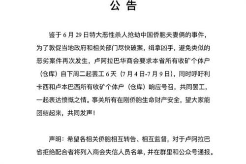 盧阿巴拉華僑商會。此前就發布了安全預警,提醒了各單位需要加強安保建設,特別是外出人員的安全,也建議不要身上攜帶大量的現款,這一次的事件也使商會更加強調所有人員的安全問題,也希望可以通過懸賞和罷工的舉措,使當地政府與有關部門采取措施,保證華僑的生命安全以及財產安全。