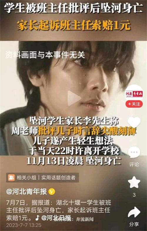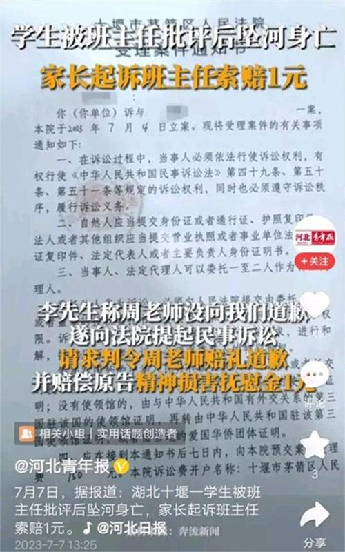 近日,湖北十堰市鄖陽(yáng)中學(xué)一名高三的學(xué)生被班主任批評(píng)以后跳河身亡,家長(zhǎng)們起訴班主任索賠一元錢,這名學(xué)生的家長(zhǎng)李先生稱自己兒子是該中學(xué)的一名高三學(xué)生。在2022年11月12日的晚自習(xí)的時(shí)候,兒子被他的班主任周老師批評(píng)了,并且還要求他寫一份檢討,李先生說(shuō),如果班主任只是平常的批評(píng)教育就算了,關(guān)鍵自己的老師在批評(píng)兒子的時(shí)候,說(shuō)話非常刻薄。對(duì)兒子又是挖孔,又是諷刺的。當(dāng)著全班的面兒批評(píng)一個(gè)高三的學(xué)生,這導(dǎo)致了小李同學(xué)精神有點(diǎn)恍惚,也打不起精神。