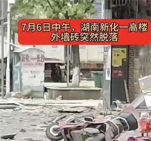 近日,在湖南新化附近有1棟32層高的墻外樓磚塊突然掉下砸中數(shù)人,周邊停靠的車輛也有不同程度受損,本次事故導致三人受傷。北京時間7月6號網(wǎng)上出現(xiàn)了一則32層高樓外墻脫落的視頻引發(fā)關注,能夠從視頻中看到現(xiàn)場散落大小不同的磚塊,能夠看到摩托車被砸倒。