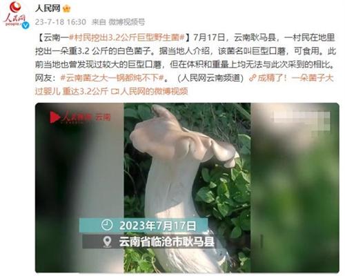 云南耿馬縣一村民在7月17日挖出了3.2公斤的白色菌子,據當地人解釋這個菌子的名字叫做巨型口蘑,這個蘑菇是可以使用的,當地也曾經發現過較大的巨型口蘑,不過在重量和體積上無法與本次采摘到的口蘑相比。報道報出,矩形口膜的重量是3.2公斤,長度大概在一米左右,一只手是很難抱住的,引起了很多網友的關注和熱議。