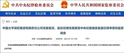 7月18日下午中紀委國家建委網站發布一則消息,中國太平保險集團有限責任公司的黨委委員副總書記肖星,涉嫌嚴重的違紀違法,目前已接受中央紀委國家監察委員會的紀律審查以及監察的調查。早些時間就有消息表示,肖星已經聯系不上。