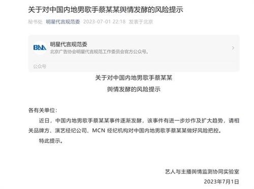 北京廣告協(xié)會(huì)所發(fā)布的有關(guān)蔡某某風(fēng)險(xiǎn)提示的內(nèi)容已經(jīng)于7月19日刪除。日前蔡徐坤被曝光2021年5月曾經(jīng)與某C姓女生發(fā)生關(guān)系,導(dǎo)致其懷孕打胎,在網(wǎng)絡(luò)上引起熱議。北京廣告協(xié)會(huì)于7月1日晚間發(fā)布風(fēng)險(xiǎn)提示,指出蔡某某事件近日逐漸發(fā)酵,有進(jìn)一步擴(kuò)大和炒作的趨勢(shì),請(qǐng)演藝公司、品牌方和經(jīng)紀(jì)公司對(duì)蔡某某做好風(fēng)險(xiǎn)把控。