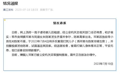 廉江市公安局以及相關(guān)部門(mén)對(duì)此事進(jìn)行了走訪(fǎng)調(diào)查,核實(shí)了視頻中的情況,并發(fā)布通告:視頻中男子鄧某由于與女友發(fā)生爭(zhēng)吵,女友離家出走,自己一人在家中帶小孩,對(duì)女友非常不滿(mǎn)。7月14日拍攝視頻對(duì)嬰兒狂扇耳光,嬰兒是鄧某與女友非婚生育的孩子,拍攝視頻的目的就是為了逼迫女友回家。嬰兒已經(jīng)被送往醫(yī)院進(jìn)行檢查,身體情況正常。虐待嬰兒的男子鄧某已經(jīng)被公安機(jī)關(guān)采取強(qiáng)制措施,此案正在進(jìn)行,進(jìn)一步的辦理當(dāng)中。