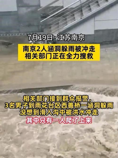 有網(wǎng)友7月19日發(fā)布視頻表示江蘇南京雨花臺(tái)的一處涵洞附近有三名躲雨的男子被洪水沖走,其中有一人被救,另外兩人下落不明。根據(jù)發(fā)不出的視頻可以看出,事發(fā)地點(diǎn)積水很嚴(yán)重,水流非常急。事故現(xiàn)場(chǎng)有大量的救援人員,正在附近實(shí)施救援。視頻拍攝者表示南京7月19日下午突發(fā)暴雨,事發(fā)涵洞的地點(diǎn)是雨花臺(tái)區(qū)西善橋附近,聽(tīng)說(shuō)有人在涵洞中躲雨時(shí),不小心滑到了水溝里,三人中只有一人爬了上來(lái),另外兩人被沖走。