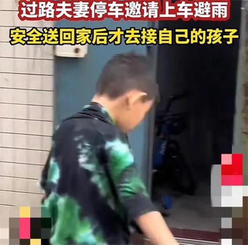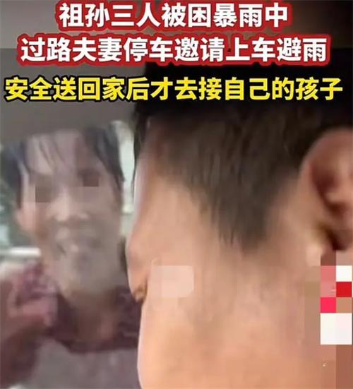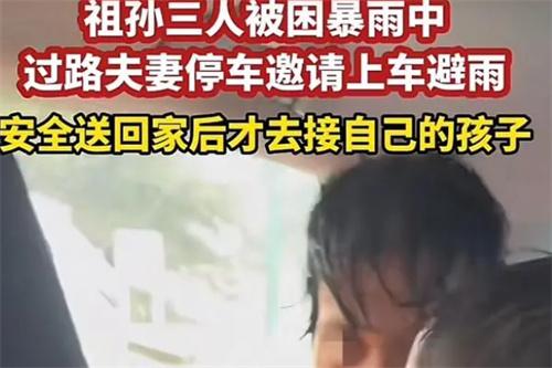 有一對夫妻看到祖孫三人被困雨中立馬停車邀請上車避雨,將祖孫三人安全送回家之后才去接自己的孩子。近日山西省河津發生了一件助人為樂的事,通過網上拍攝的視頻可以看到一場暴雨導致祖孫三人被困在雨中,車子沒有辦法繼續向前騎行,一對夫妻看到這個情況之后立馬將車子停下來,邀請祖孫三人趕緊上車避雨,只見他們打開車門對兩個孩子說快快小朋友趕緊上車。還招呼孩子奶奶說阿姨你也趕緊上車避雨,把車子先放在那等雨停了再騎,祖孫三人渾身已經被暴雨淋透,夫妻二人沒有嫌棄他們反而把三人全部送回家,才返回學校接自己的孩子。