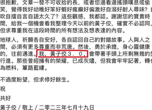 黃子佼在文章中向多年前被自己傷害過的受害者道歉。也表示了自己將會繼續(xù)向前邁進的態(tài)度。根據(jù)早前媒體報道黃子佼6月份陷入了性騷擾風(fēng)波,酒后拍攝了三段視頻發(fā)布在網(wǎng)絡(luò)上公開道歉。拍攝過程中情緒一度失控,爆出很多娛樂圈猛料,最后黃子佼自殘被送往醫(yī)院救治,距離黃子佼性騷擾風(fēng)波已經(jīng)過去了一個月的時間,黃子佼在7月19號晚上發(fā)出了一篇將近2萬字的文章,還原放出了自己在網(wǎng)上發(fā)布爆料視頻之后的自稱經(jīng)過引發(fā)了網(wǎng)友的熱議。