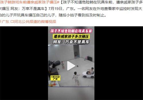 網(wǎng)友查看家里視頻時發(fā)現(xiàn)大伯的兒子開著玩具車不斷碾壓自己的兒子,被小姑子看到后及時制止。7月19號廣東一名網(wǎng)友發(fā)布一則視頻,在視頻里面能夠看到有一個小孩子開著玩具車不斷去碾壓另外一名幼兒。網(wǎng)友看到該視頻之后紛紛留言幸好不是真車。該事件也引發(fā)了網(wǎng)友的關注認為給孩子提高危險意識是一件非常重要的事情。