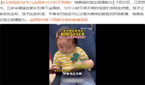 孩子平時比較聽話,會對他進行以父母為榜樣的鼓勵式積極教育培養孩子的獨立自理能力。北京時間7月23號江蘇蘇州三歲半的萌娃在家長的陪伴下乘坐高鐵,搭乘高鐵的10個小時內孩子不哭不鬧的視頻憑引發了網友的點贊。孩子爸爸表示孩子的獨立能力非常強,平常采取鼓勵式教育。