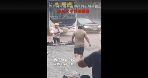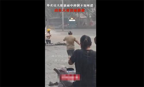 7月28日,濟南一位女外賣員在狂風暴雨當中跌倒,之后兩名熱心市民挺身而出幫助她扶起電動車的消息引起了人們的關注。
