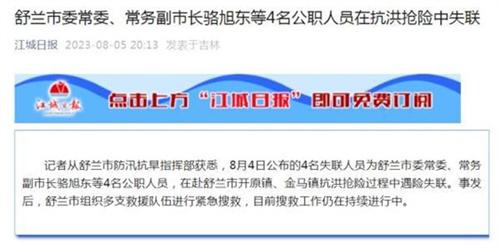 8月4日,吉林省舒蘭市防汛抗旱指揮部發布公告稱,在公布了四名失聯人員當中,有一位是舒蘭市委常委,常務副市長駱旭東,而其他三名失聯的人員也是政府的工作人員,駱旭東在前往金馬鎮和開元鎮進行抗上線的過程當中遇到了危險。到現在為止也沒有能夠搜救得到,目前舒蘭市已經派出了多個救援隊伍對陸西東進行救援,但依舊沒有能夠得到任何的結果。
