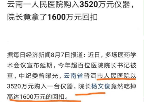 近期,關于中紀委曝光一臺直線加速器,收到的回扣是1,600萬的話題登上了社交平臺的熱搜榜榜首。一臺直線加速器,院長收了1,600萬的回扣,這個信息來源于今年5月份云南省普洱市人民醫院原黨委書記、院長楊文俊將一臺進口價格在1,500萬元的醫療器械醫院,以3,520萬元的價格購入,這樣的價格高于同期市場價格的兩倍以上,在這當中楊文俊一共拿了1,600萬元的回扣。
