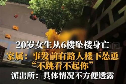 在網(wǎng)絡(luò)流傳的視頻當(dāng)中,可以了解到事發(fā)地點(diǎn)是永康的一座公寓樓樓頂,在視頻片段當(dāng)中能夠看到樓頂圍滿了人,其中有一名身穿白色衣服的女子在樓邊上不斷的踱步,旁邊有人大喊不跳就看不起你,之后女生一躍而下,音頻當(dāng)中也錄下了女子在墜樓時(shí)的慘叫聲。對于這樣的情況,視頻發(fā)布者向記者表示,死者的家屬目前已經(jīng)報(bào)案,并要求調(diào)查現(xiàn)場是否存在著因?yàn)槠鸷逶蛩鶎?dǎo)致女生輕生的情況。