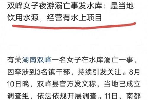 因為死者是不會游泳的,所以雙峰縣官方在8月10日晚發文,聲稱在6日19:00左右,雙峰縣杏子鋪鎮發生女子在水庫溺亡的事件,本次事件發生之后,引起了縣政府的高度重視,成立起由紀檢監察、公安、政法、鄉鎮組成的調查組會依法依規的展開調查,當前調查工作也在進行當中。