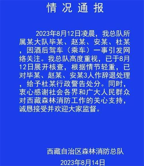 酒駕一直都是社會當(dāng)中比較嚴(yán)肅的一個問題,同時也是公眾們一直關(guān)注的一個焦點,無數(shù)的事實告誡著市民朋友們,千萬不要酒后駕車,酒后駕車造成的后果是難以想象的。近期西藏自治區(qū)森林消防總隊發(fā)布了一則聲明,四名消防隊員在酒后駕車被舉報,在消防總局查清了事實真相之后,立即對他們四人進(jìn)行了嚴(yán)厲的處罰,其中三人當(dāng)場開除,另外一人給予行政警告和處罰。