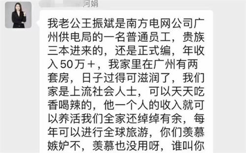 根據網絡上流傳的聊天記錄顯示,這名女子在小區業主群內發消息,稱自己的老公是廣州供電局一名普通員工,“三本進來的”,如今有正式編制,而且年收入達到50萬以上,這位女子還自稱自家是上流人士,面對群里其他人的提醒,她還表示“看不慣可以轉發,我就是炫富”,這段話讓人感到難以理解,不過有人了解到此前這名女士的丈夫王某就曾被他的妻子實名舉報,實際上她并不是在炫富,而是變相在曝光自己丈夫的行為。