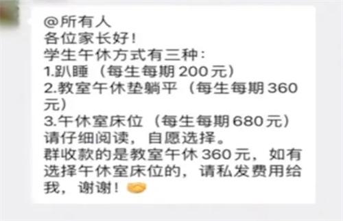 據(jù)悉該學(xué)校是東莞市虎門捷勝學(xué)校根據(jù)網(wǎng)友截圖,能夠看到在一個微信群里面有一個老師向家長們收取午休費用,每個學(xué)生每學(xué)期趴在桌子上午睡將會收取200元,在教室里的午休墊躺平睡覺收取360元,午休室的床位每學(xué)期要繳納680元,根據(jù)家長自愿選擇。