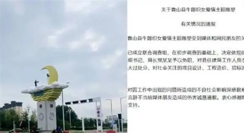 近日河南魯山縣的牛郎織女愛情主題雕塑受到了人們的關注,魯山縣已經成立聯合調查組,經過初步調查之后,決定依規依紀對負有直接責任的縣住建局黨組書記、局長黨某某予以免職,對縣住建局工作人員李某某言辭不當的行為給予政務記大過處分,對項目設計、工程造價、招標流程等方面進行全面的審查。