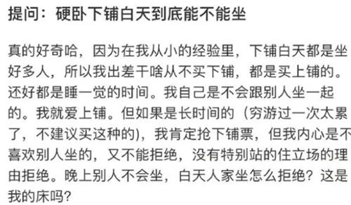 還有一方網友認為下鋪應該讓別人坐,出門在外大家都不容易應該互相諒解。小的時候我們出遠門大多都是選擇臥鋪出行,從來就沒有人說不讓別人做自己的下鋪。