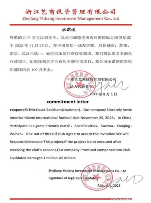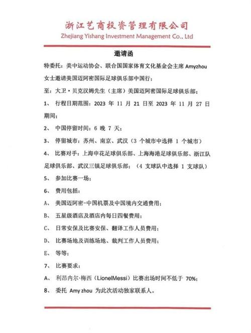 浙江的某個(gè)企業(yè)向貝克漢姆和邁阿密國(guó)際以及梅西本人發(fā)布了相關(guān)邀請(qǐng),希望他們能夠在11月21號(hào)~27號(hào)來(lái)中國(guó)與中超球隊(duì)踢一場(chǎng)比賽,總的假期為七天六個(gè)晚上,而這一次地區(qū)是蘇州、南京、武漢三個(gè)地方選一個(gè)地方作為比賽的場(chǎng)地,而對(duì)陣的球隊(duì)極有可能是上海海港、上海申花、浙江隊(duì)、武漢三鎮(zhèn)這四支中超球隊(duì)當(dāng)中的一個(gè),同時(shí)在邀請(qǐng)函當(dāng)中還提到了要求梅西必須在場(chǎng)上有70%的上場(chǎng)時(shí)間,雖然現(xiàn)在并不知道這一張邀請(qǐng)函的真假,只能夠等待11月份,看看梅西是否會(huì)來(lái)到中國(guó)才能夠驗(yàn)證。