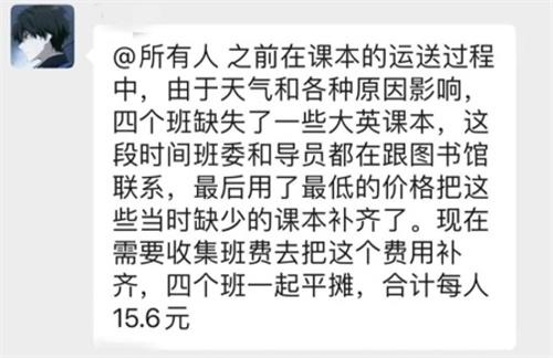 近日,山東臨沂大學學生爆料稱學校一個學院的英語課本在運送途中由于天氣和各種原因,導致部分課本丟失,網傳微信聊天截圖顯示需要四個班一起平攤,通過收集班費把費用補齊,合計每人15.6元,這一消息引起了人們的關注。