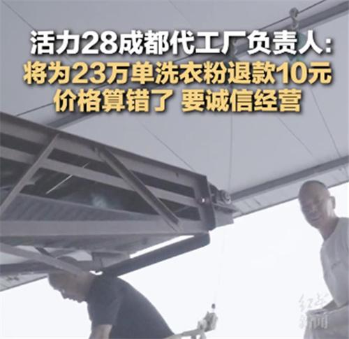 由于初次直播大叔們把3公斤的洗衣粉價格和5公斤的洗衣粉價格搞錯了,每單最后成交的時候貴了10塊錢,發現這個價格失誤之后活力28的成都工廠副總經理就表示要把這10元錢退還給消費者,當天一共成交了23萬單,每單退10元合計起來就是230萬,很多網友都表示現在這樣的良心企業已經很少見了,我們一定要把這個企業盤活,錯過就再也沒有了。