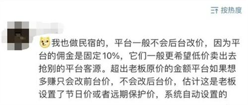 有一位網(wǎng)友在看到這條消息后,稱(chēng)自己就是開(kāi)民宿的,開(kāi)民宿的網(wǎng)友表示平臺(tái)在一般情況下并不會(huì)從后臺(tái)去調(diào)整民宿的價(jià)格,因?yàn)槊恳患颐袼拊趻焐掀脚_(tái)之后,平臺(tái)都會(huì)抽取10%的固定的傭金。正常情況下,這些平臺(tái)更希望能夠以較低的價(jià)格將酒店給預(yù)定出去,而這家民宿的價(jià)格之所以會(huì)發(fā)生如此大的變化。很有可能是這家老板設(shè)置了節(jié)日價(jià)格,或者是系統(tǒng)自動(dòng)對(duì)民宿價(jià)格去進(jìn)行的調(diào)整。
