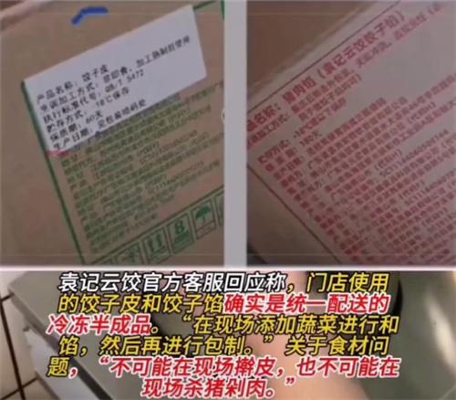 記者結(jié)束了和這家店鋪工作人員的對(duì)話之后,也和袁記云餃的品牌客服人員取得了聯(lián)系。該品牌的客服人員在聽(tīng)聞?dòng)浾咛釂?wèn)到餃子皮和餃子餡是否屬于凍貨這一問(wèn)題是工作人員直接表示,門店所使用的餃子皮和餃子餡全部都是經(jīng)過(guò)公司統(tǒng)一去進(jìn)行配送的半冷藏類食品。