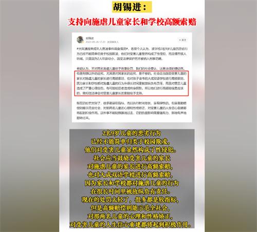 這針對(duì)起事件,資深媒體人胡錫進(jìn)發(fā)表了自己的看法,他認(rèn)為這起事件已經(jīng)不能簡(jiǎn)單歸結(jié)于校園欺凌,兩名九歲兒童的惡劣行為對(duì)受害兒童構(gòu)成了人嚴(yán)的性侵犯,而且情節(jié)簡(jiǎn)直駭人聽(tīng)聞,不能夠僅因?yàn)閮扇四暧资芊杀Wo(hù)就不被納入刑事范疇內(nèi)。