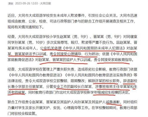 9月26日,央視新聞發(fā)布一條動(dòng)態(tài),該動(dòng)態(tài)表述,山西省大同市聯(lián)合工作組發(fā)布通報(bào),大同市大成雙語(yǔ)學(xué)校發(fā)生未成年人欺凌事件,這起事件引發(fā)社會(huì)各界的廣泛關(guān)注。事件發(fā)生后大同市迅速組織的聯(lián)合工作組展開(kāi)事件調(diào)查,經(jīng)過(guò)調(diào)查得知,大同市大成雙語(yǔ)學(xué)校的小學(xué)生趙某,晉某對(duì)同寢室的同學(xué)孫某實(shí)施多次毆打,辱罵等不良行為。由于涉案嫌疑人均為未成年人,公安機(jī)關(guān)依據(jù)預(yù)防未成年人犯罪法對(duì)上述二人予以訓(xùn)誡,責(zé)令其接受心理輔導(dǎo),對(duì)行為進(jìn)行矯正,一區(qū)家庭教育促進(jìn)法對(duì)趙某和金某的監(jiān)護(hù)人予以訓(xùn)誡,責(zé)令上述人群接受家庭指導(dǎo)教育。