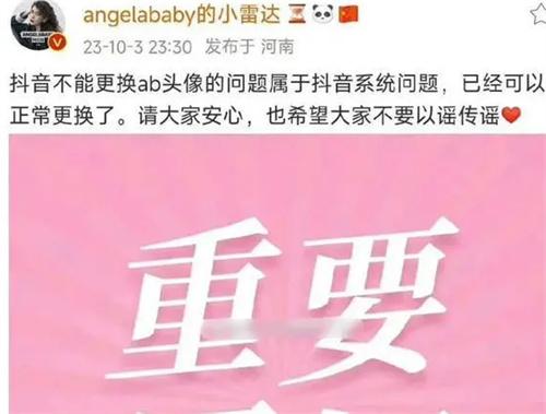 北京時間10月4號,針對網(wǎng)絡(luò)上傳言Angelababy已經(jīng)遭到封殺,某平臺的用戶想要將Angelababy的相關(guān)頭像更改卻出現(xiàn)了頭像無法更改的情況。針對頭像無法更改的問題Angelababy方面也進行了回應(yīng),抖音不能夠更換baby頭像的問題是屬于抖音系統(tǒng)問題,目前已經(jīng)可以正常更換也希望大家不要以謠傳謠。